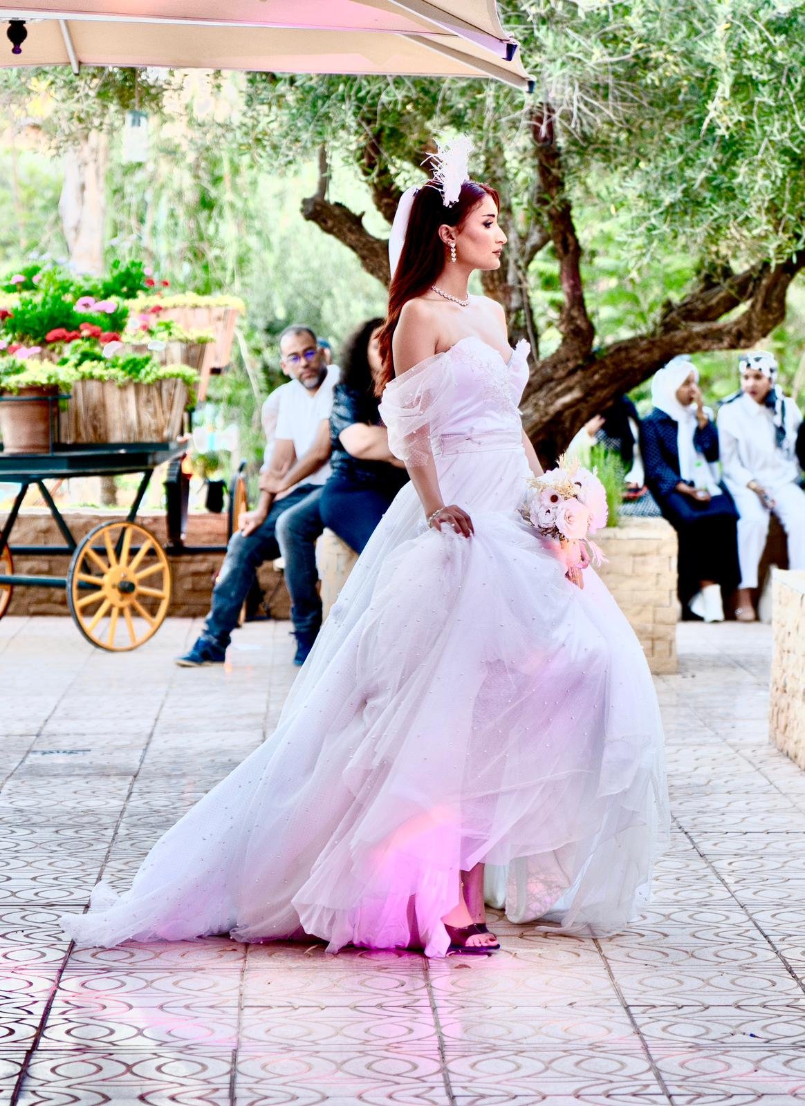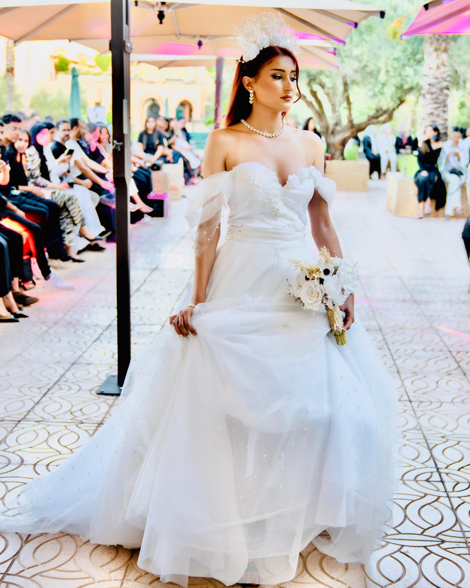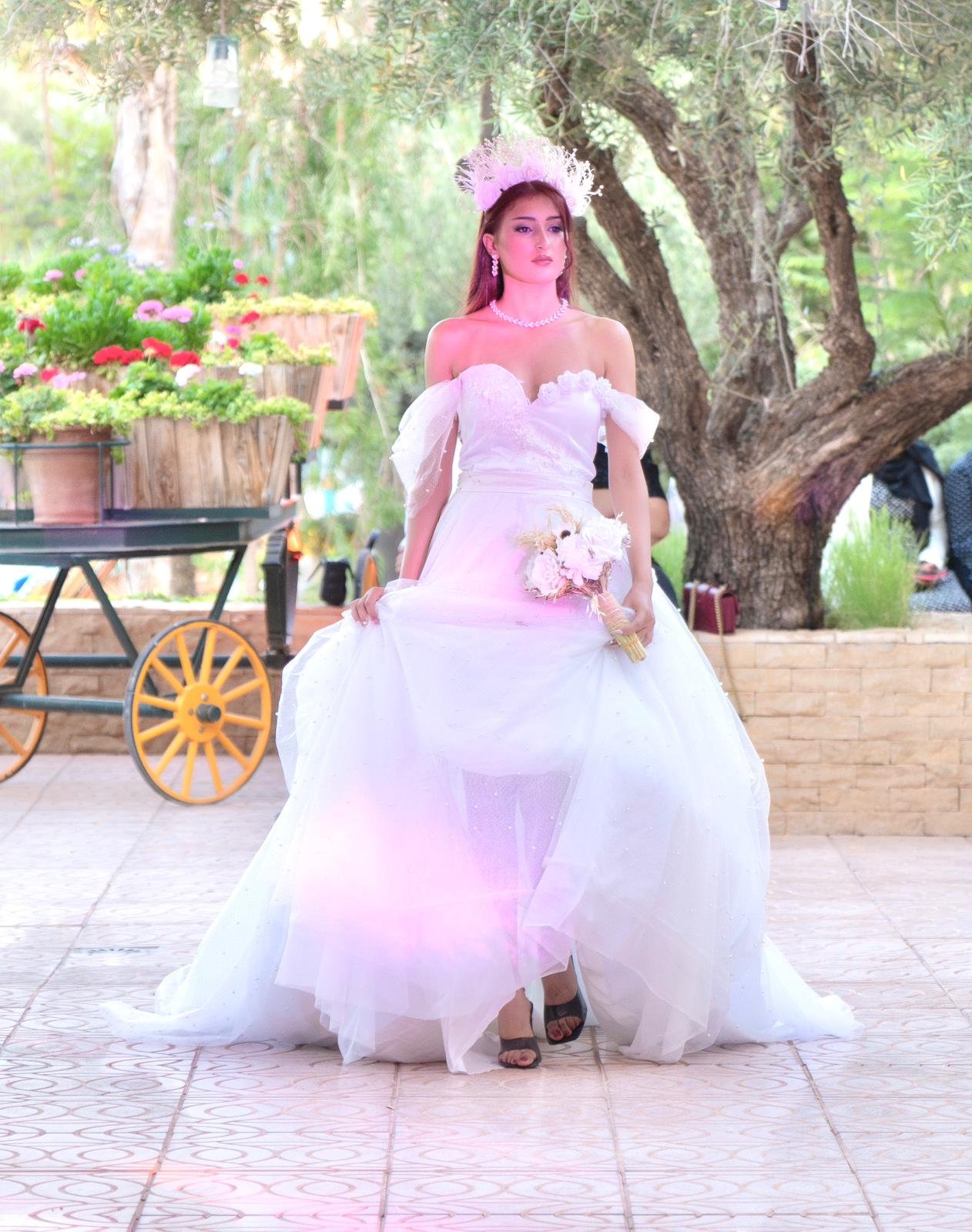 Step into a fairytale with the Enchanted Elegance Bridal Gown. This stunning wedding dress features an exquisite off-the-shoulder design adorned with delicate floral appliqués and shimmering pearls. The fitted bodice gracefully transitions into a voluminous skirt, creating a timeless silhouette that is both romantic and regal. A crown of roses adds the perfect finishing touch, making this gown an ideal choice for brides seeking a look of pure enchantment on their special day. The elegant design and attention to detail ensure you'll feel like royalty as you walk down the aisle.
