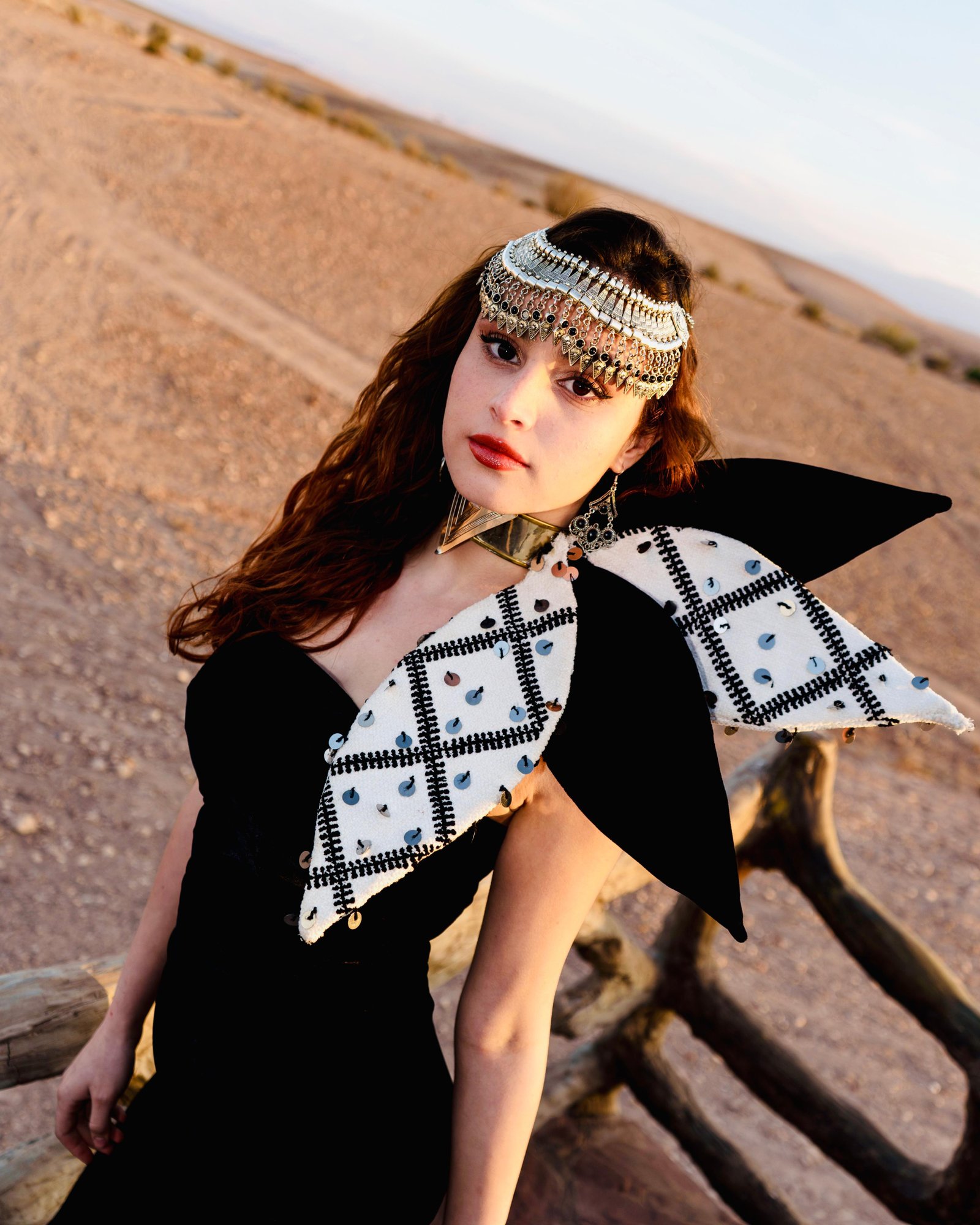 The Queen of the Dunes gown is an ode to power, mystery, and regal elegance. This striking black velvet creation molds to the body, exuding sophistication with a modern, avant-garde edge. The form-fitting silhouette extends into a flowing train, adding an air of effortless majesty, while a daring thigh-high slit brings a touch of bold sensuality. The show-stopping element of this gown is the sculptural shoulder piece—a geometric, asymmetrical design combining black velvet and a textured monochrome checkered fabric adorned with delicate beaded embellishments. This dramatic accent symbolizes strength and artistic rebellion, making the dress an unforgettable statement piece.